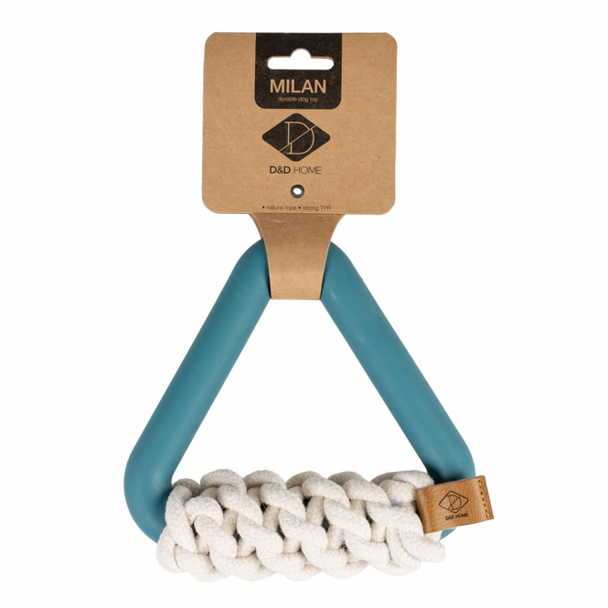 Das D&D Hundespielzeug Milan ist ein Hundespielzeug aus robustem TPR-Gummi in trendigen Farben. Es ist außerdem mit einem Baumwollseil ausgestattet. Das Baumwollseil ist ein beliebtes Kaumaterial für Hunde und pflegt ihre Zähne und ihr Zahnfleisch. Die dreieckige Form ist ideal für Apportier- und Tauziehspiele.