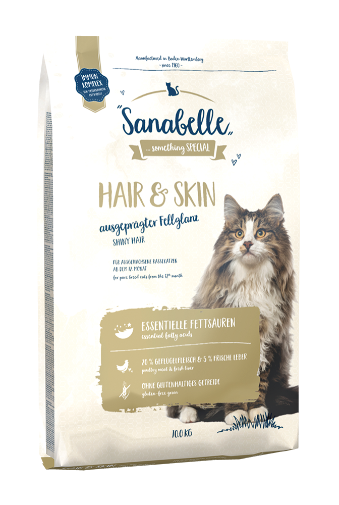 Sanabelle Hair & Skin ist eine besonders auf die Verbesserung der Felleigenschaften entwickelte Vollnahrung für ausgewachsene Katzen. Die hohen Anteile an wertvollen Ölen und Fetten k&ouml-nnen für ein elegantes, glänzendes und geschmeidiges Haarkleid sorgen (shiny hair). Die in Sanabelle Hair & Skin eingesetzte Kombination von Vitaminen und Spurenelementen unterstützt zusätzlich die positive Wirkung auf Haut und Haare und ist deshalb besonders auch für Deine Rassekatze geeignet.